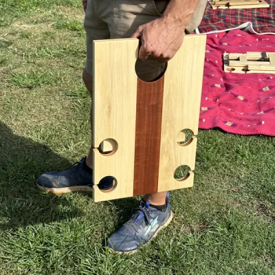 The new “Bottle and Glass” Travel Wine Table is more compact and lighter than the original Portable Wine Table. The top of this version measures 18” x 12”, providing space for snacks, four standard wine glasses, and your favorite bottle of wine. When opened, the table measures 10” high, and the folded thickness is just over 2”. Table weight is only 4 pounds! The bottle hole doubles as a convenient carry handle, and a lever on the bottom ensures the legs remain folded during transport. These tables are made with Poplar hardwood, and the tops feature a choice of four contrasting wood species for a decorative accent stripe. Wood options for the contrasting stripe are Padauk, Walnut, Cherry, and Sapele. Each table is finished with three coats of a food-safe, oil-based finish, providing a durable, liquid-repellant seal. Cleaning is as easy as a quick wipe with a damp cloth. Shipping weight 4 lb.